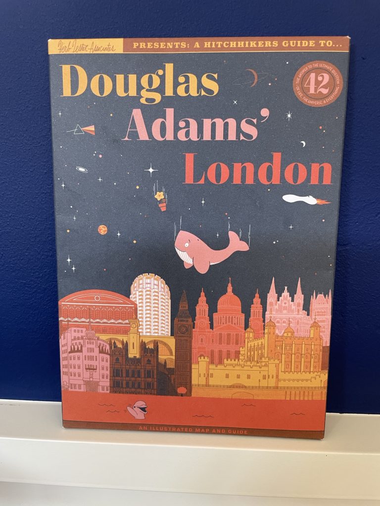 I was thrilled to receive this map in the mail from Herb Lester! The packaging is beautiful. The illustrations are adorable, and the winged dog is my favorite. The 42 places are described with details, trivia, and interesting facts that make me want to buy a ticket and go to London to experience it all myself. This map belongs in any Douglas Adams fan’s library. I may have to buy another one, so I can frame both sides to hang next to my towel!