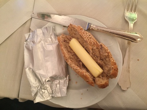 We ate at Cafe Imperial, and I learned to be very careful when telling waiters they can “take the bread course away.” Here’s a picture of the odd, fancy butter tube and the delicious looking roll I was going to eat.
